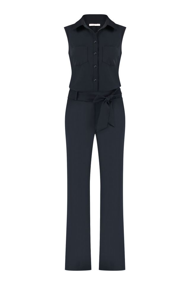 Stap stijlvol de lente en zomer in met de donkerblauwe Angel sleeveless jumpsuit van Studio Anneloes, een essentieel kledingstuk dat moeiteloos elegantie en comfort combineert. Deze jumpsuit, met zijn wijde rechte pijpen, is een verfijnde variatie op de populaire Angelique jumpsuit, waardoor het een veelzijdige keuze is voor elke gelegenheid.
