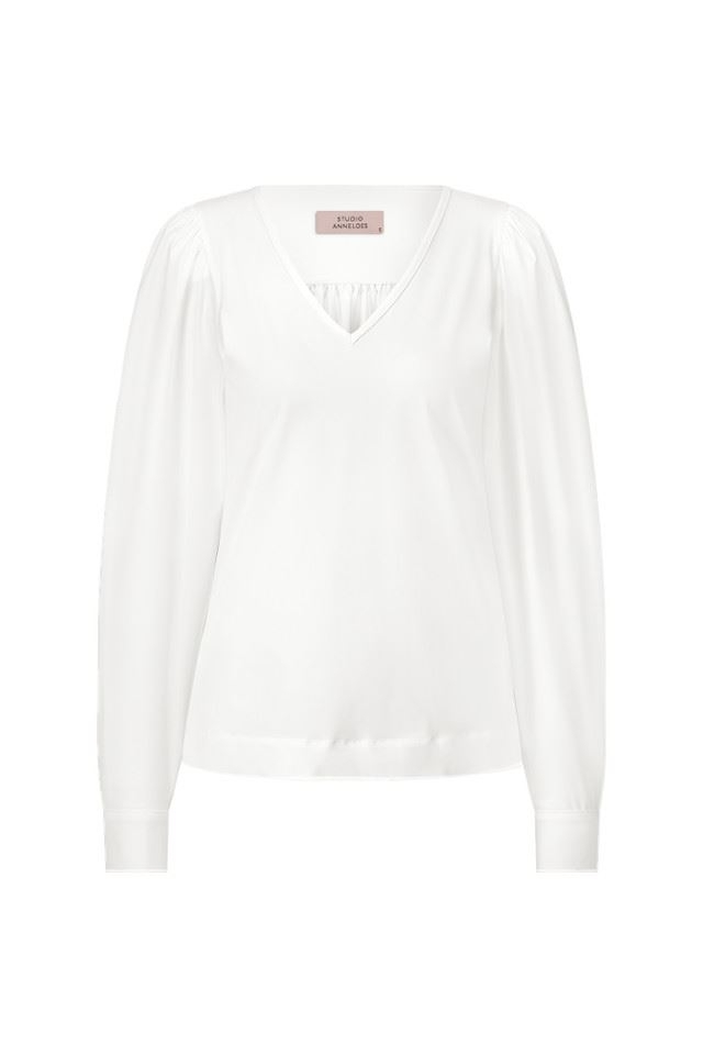 Op zoek naar een stijlvolle basic die je eindeloos kunt combineren? De Les top van Studio Anneloes is precies wat je nodig hebt. Deze elegante Off White top heeft een vrouwelijke V-hals en subtiele pofmouwen met manchetten, wat haar een verfijnde en modieuze uitstraling geeft. De regular fit en de soepele Medium Travelstof zorgen voor een comfortabele pasvorm die mooi in model blijft.