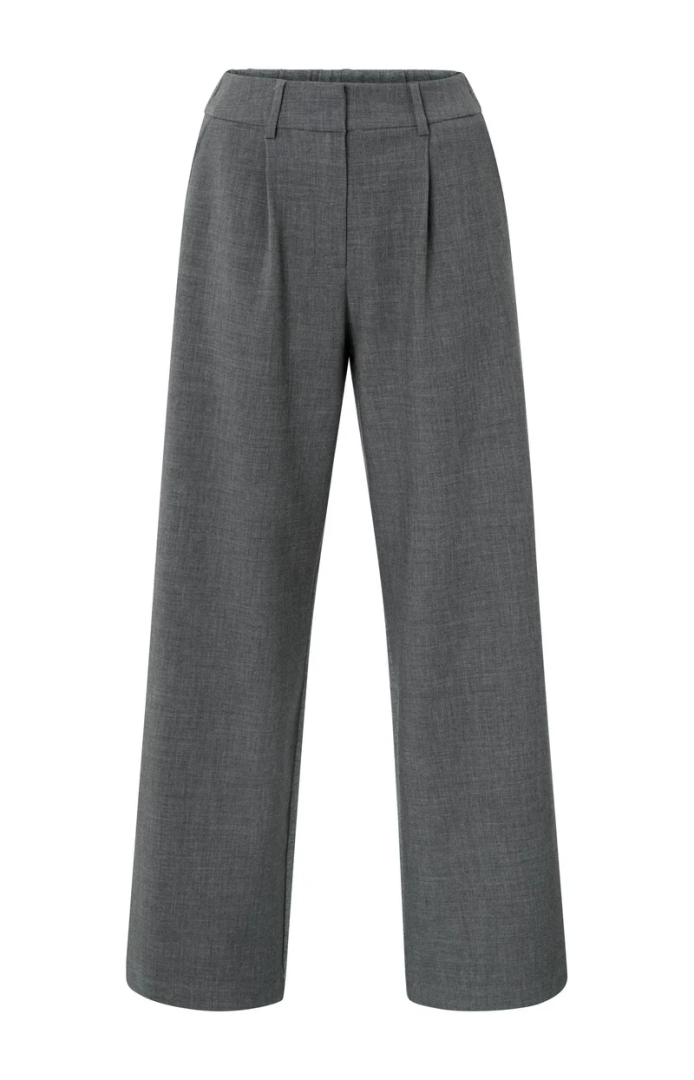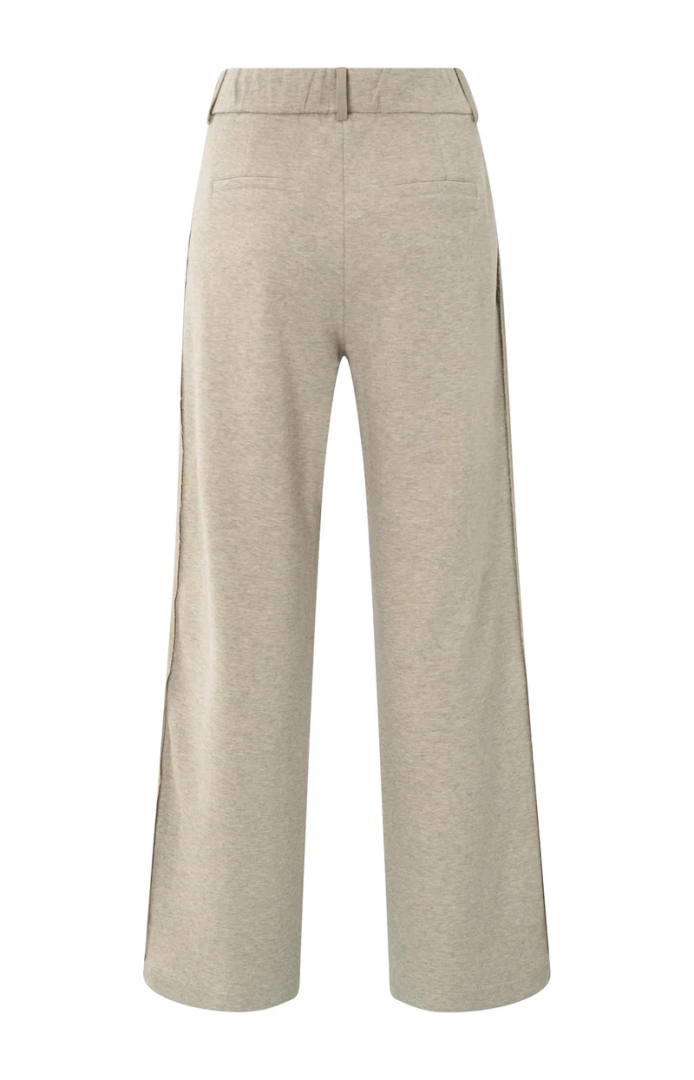 Deze stijlvolle broek heeft een geweven voorkant en een achterkant van zachte jersey stof. De elastische tailleband zorgt voor extra comfort, terwijl de wijde pijpen een elegante uitstraling geven. Afgewerkt met steekzakken voor en paspelzakken achter. Perfect voor een casual-chique look met een sportieve twist.