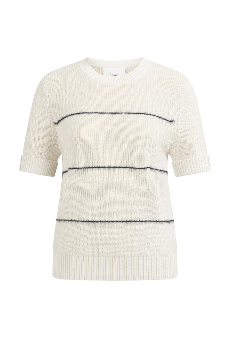 Deze comfortabele gebreide trui heeft korte mouwen en is afgewerkt met contrasterende, fluffy strepen voor een speels accent. De trui heeft een ronde hals, opgerolde mouwboorden en een normale pasvorm. De zachte structuur en subtiele details maken dit item perfect voor een casual, maar stijlvolle look.