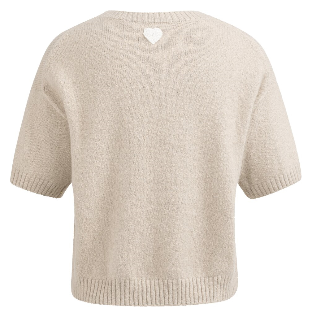 Deze zachte trui heeft korte mouwen, een ronde hals en een losse pasvorm. Het item is afgewerkt met ribgebreide boorden en een speels artwork aan de voorzijde. Op de rug prijkt een subtiel hartje voor een extra charmant detail. Perfect voor een casual look met een vrolijke twist.