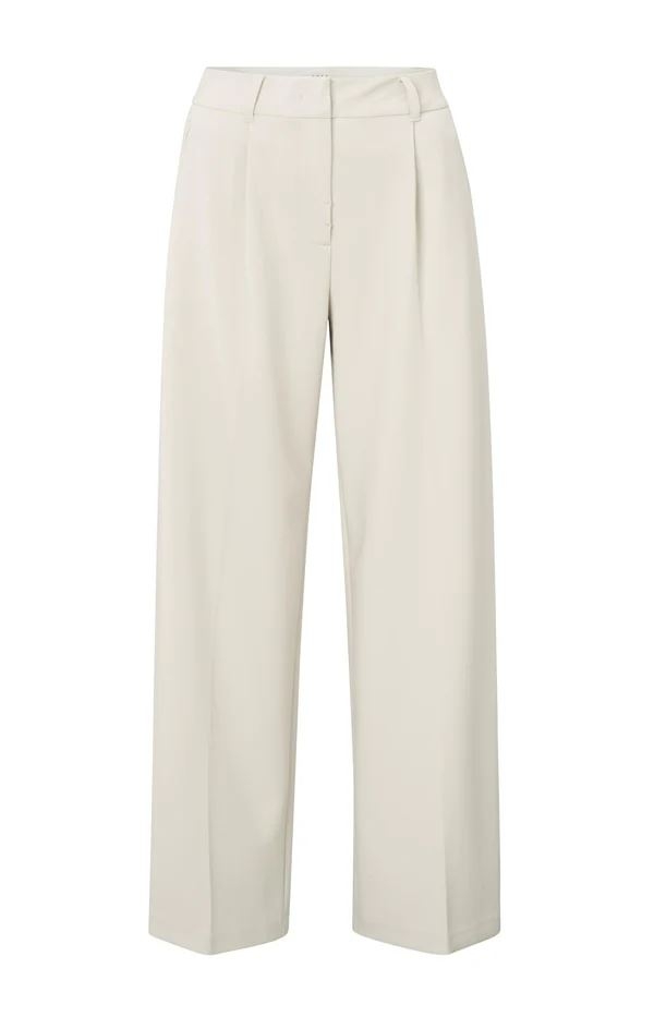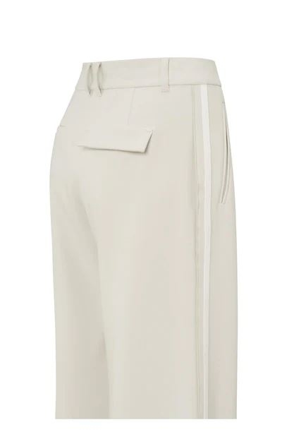 Deze elegante broek is gemaakt van een soepele, geweven stof en heeft een losse pasvorm met wijde pijpen. De hoge taille met plooidetails zorgt voor een verfijnde uitstraling, terwijl het streepdetail langs de zijkant een subtiele, moderne touch toevoegt. Voorzien van steekzakken en paspelzakken aan de achterkant. Perfect voor een stijlvolle, moeiteloze look. Het model is 173 cm en draagt maat 36.