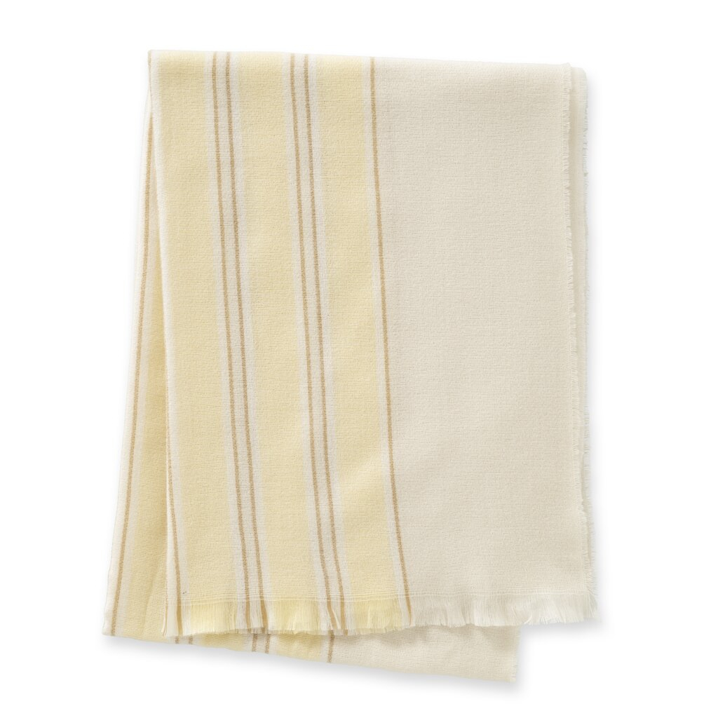 Deze lichte sjaal is geweven in een zachte kwaliteit en voorzien van een subtiel streepdessin in crèmekleurige en gele tonen. De korte franjes aan de randen geven een speelse afwerking. Perfect om je outfit een frisse en vrouwelijke touch te geven.