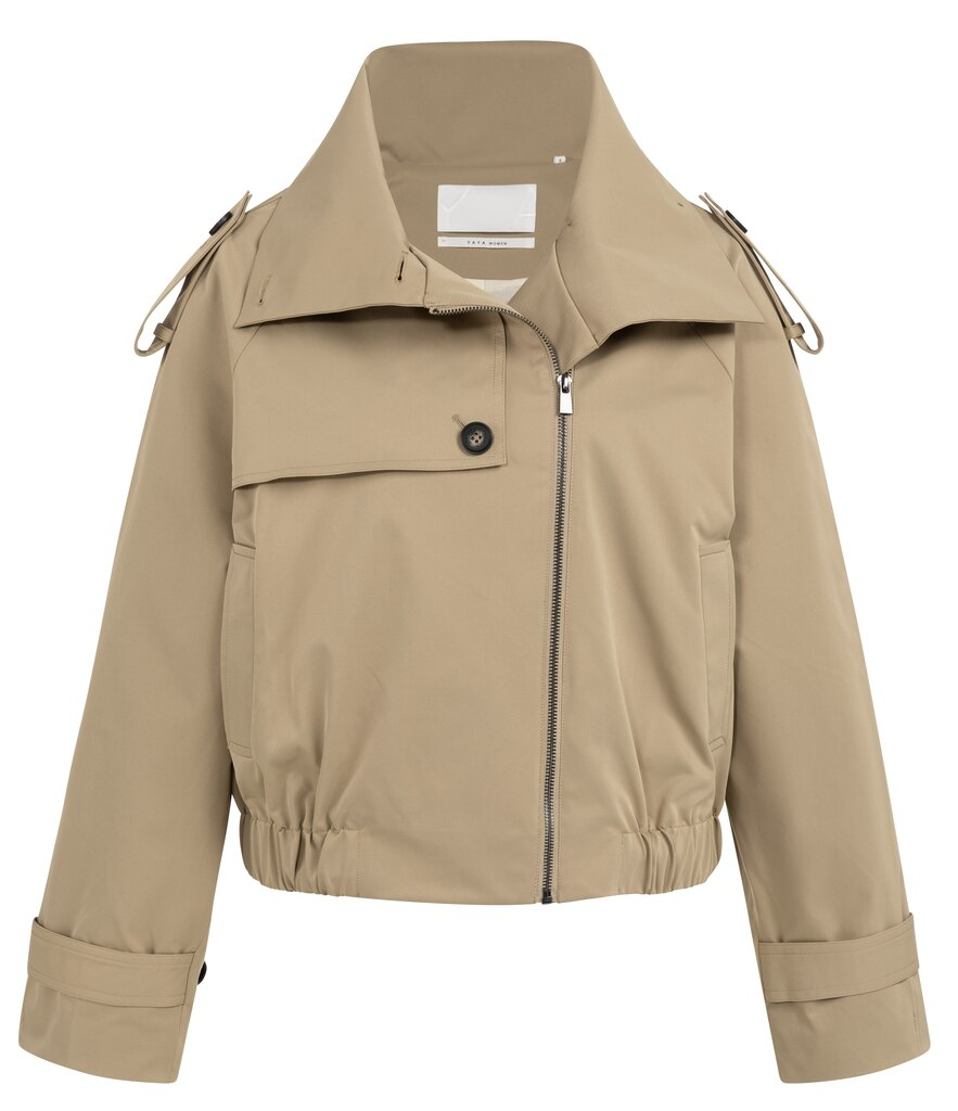 Dit korte jack combineert trenchcoat-elementen met een bomberstijl. Ontworpen met een opstaande kraag, epauletten en een schouderoverslag voor een functionele look. De elastische tailleband en manchetten zorgen voor een modern accent. Op de rug zit een klein label met de tekst 'Love of London Town'. Gemaakt van een gladde geweven stof, perfect voor het tussenseizoen.