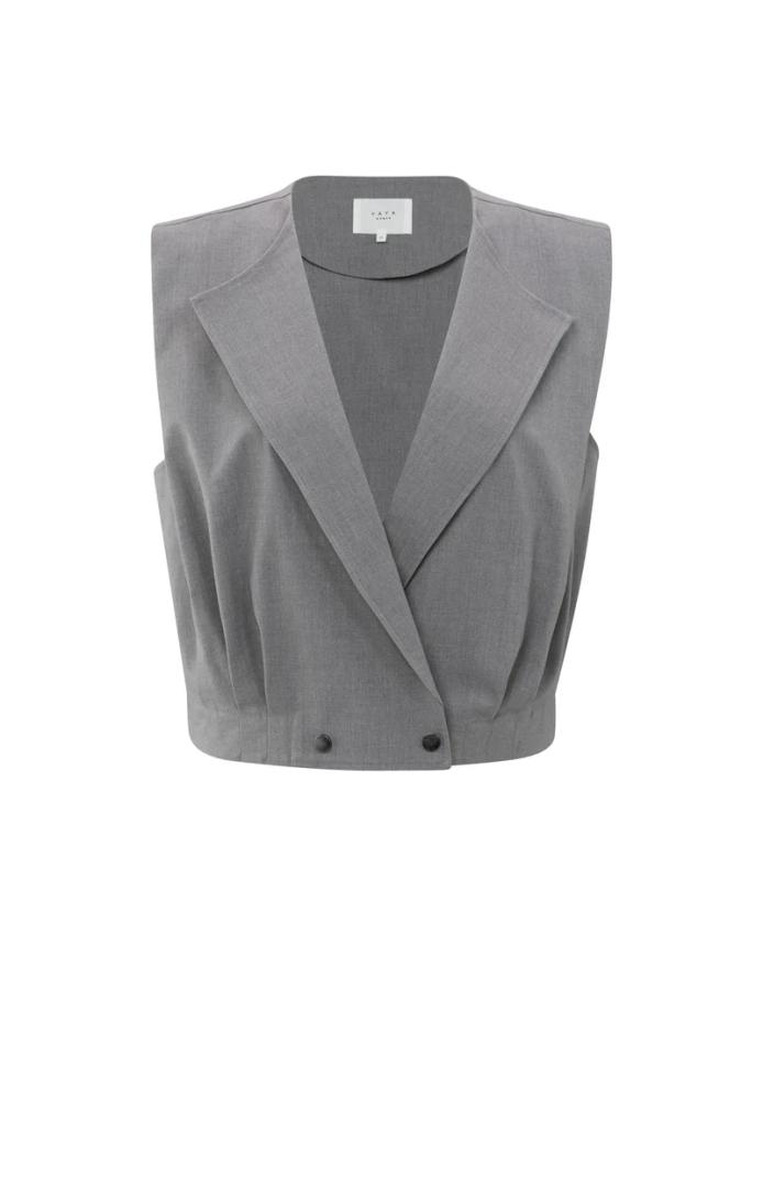 Dit losvallende, mouwloze jasje is ontworpen met een diepe reverskraag, decoratieve knopen en een elastische tailleband met gespdetail aan de achterzijde. De zachte geweven stof en de geplooide afwerking creëren een elegante, vrouwelijke pasvorm. Perfect als gelaagd item over een blouse of jurk.