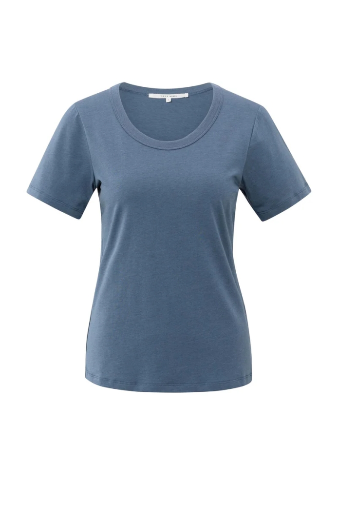 Dit basic T-shirt is gemaakt van een zachte katoenmix en heeft een ronde ribgebreide hals, korte mouwen en een aansluitende pasvorm. Het minimalistische ontwerp maakt dit shirt een veelzijdige aanvulling op je garderobe. Draag hem solo of onder een blazer of vest voor een casual gelaagde look. Het model is 176 cm en draagt maat S.