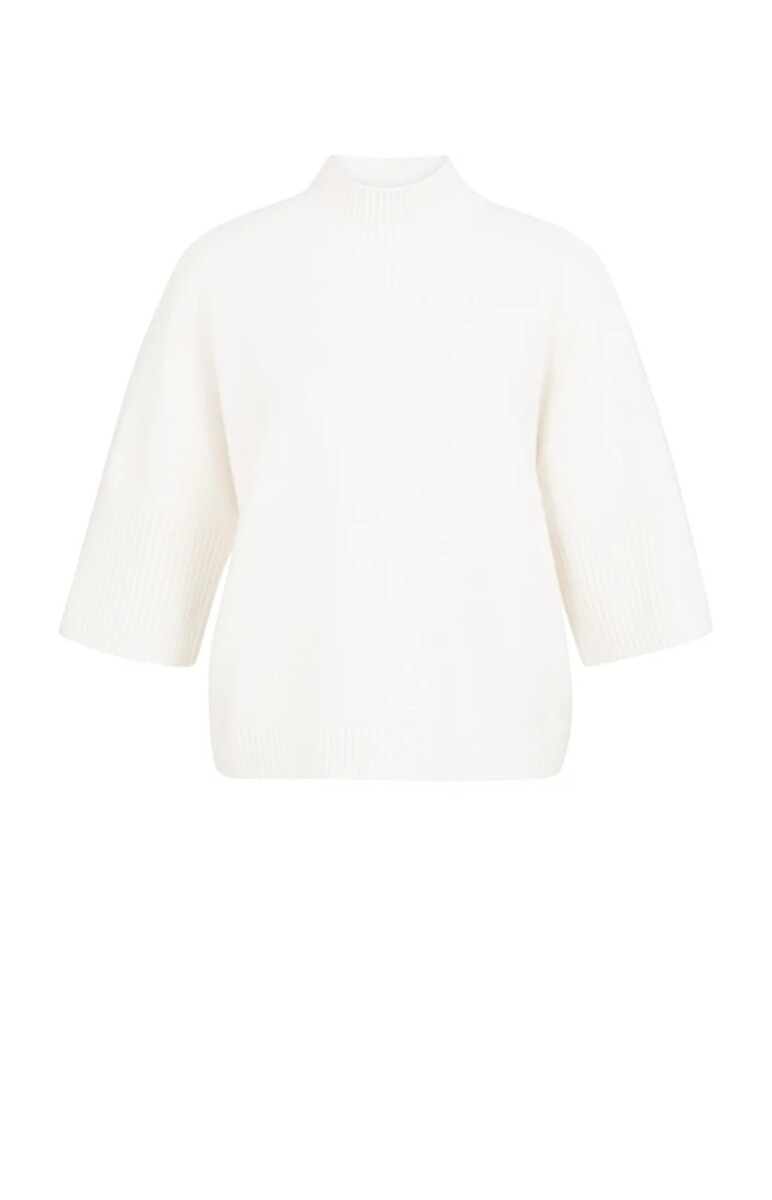 Deze comfortabele trui heeft een losse pasvorm, een geribde opstaande hals en driekwart mouwen met brede ribboorden. Gemaakt van een zachte gebreide stof die prettig aanvoelt op de huid. Dankzij het minimalistische ontwerp en de verfijnde afwerking is dit een veelzijdig item voor een stijlvolle, casual look.