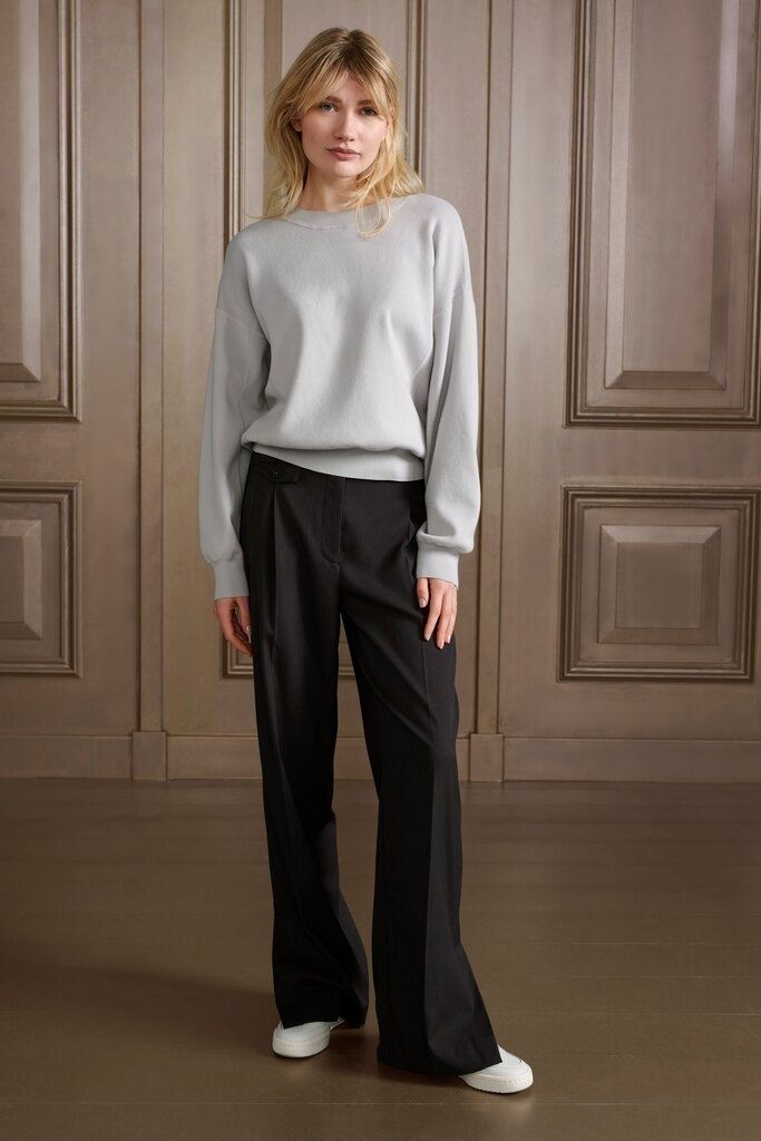 Deze elegante zwarte broek heeft een hoge taille en wijde pijpen met een split, afgewerkt met een plooi aan de voorzijde en een elastische band voor een perfecte, losse pasvorm. De broek is voorzien van twee steekzakken en een knoopdetail, wat zorgt voor een chique, maar comfortabele oversized look.